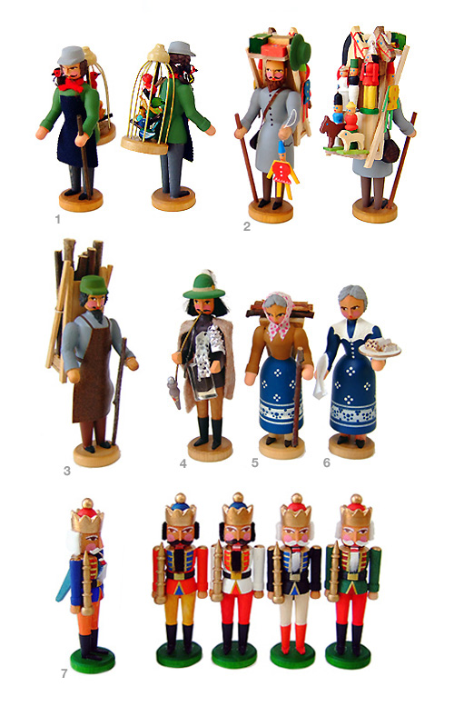 ザイフェンの伝統玩具のテーマとして一般庶民の姿が多く取り上げられている。その中でもザイフェンの歴史を語るには外せない職業がおもちゃ売り。当初、おもちゃ作りの職人は、自分で作った木製玩具を手押し車や背負子に背負って売り歩いた。ヴェルナーのおもちゃ売りもハンペルマン、天使と鉱夫、ミニチュアの動物、くるみ割りやホビーホースetc、ザイフェン名物の玩具を背負子に沢山積んでいる。そのほかにも、小鳥売り、ジンジャーブレッド売りなどの日常雑貨を売り歩いた行商人たちや、いかけ屋、森番などが人形で再現されている。どの職業人の持ち物も一つ一つ精巧に作られていて、その完成度の高さは、人形を手にする者を驚かす。